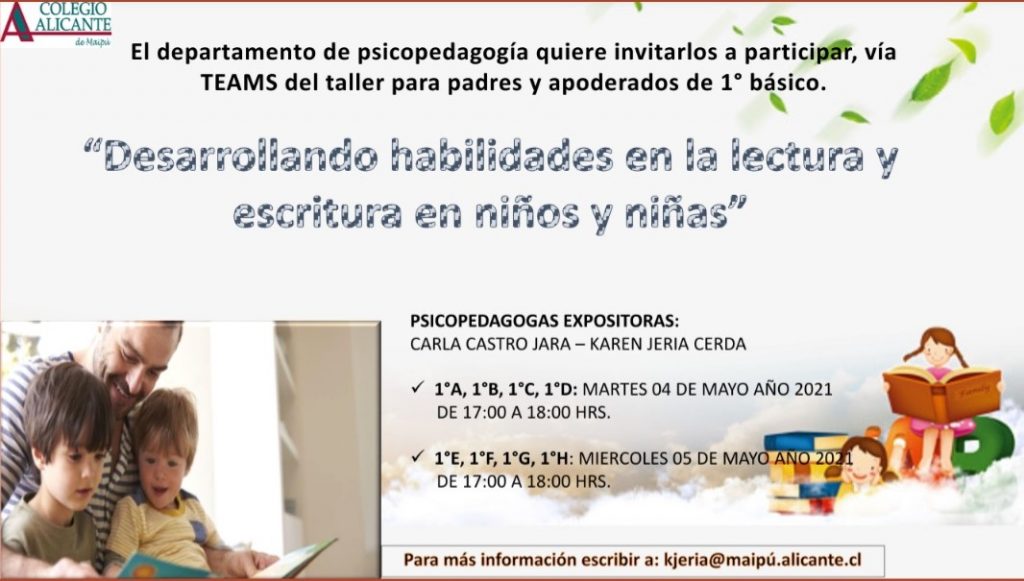 Junto con saludar y esperando que se encuentren gozando de buena salud, deseamos invitarles al taller para padres: «Desarrollando habilidades en la lectura y escritura en niños y niñas» que impartirá nuestro departamento de psicopedagogía para el nivel de 1°básico entre el martes 04 y miércoles 05 de mayo.